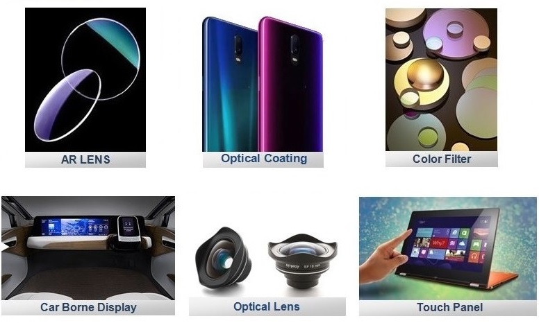 可製鍍高穿透低反射AR、彩色濾光片Color Filter ..等等光學膜。